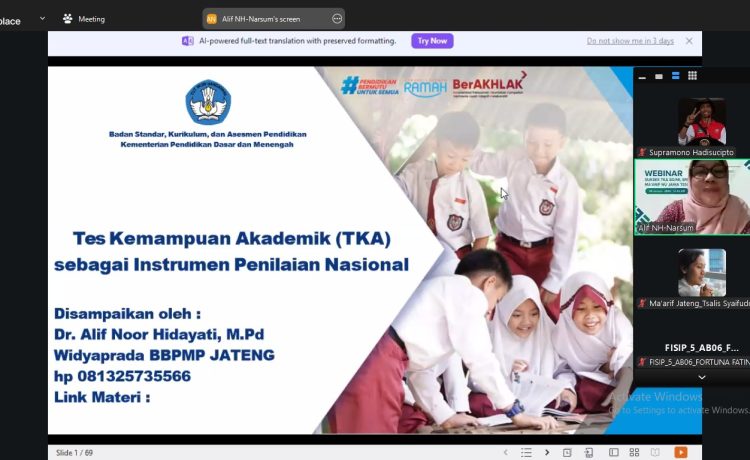 Pemaparan materi utama disampaikan oleh Dr Alif Noor Hidayati MPd, seorang Widyaprada dari Balai Besar Penjamin Mutu Pendidikan (BBPMP) Jawa Tengah. Dalam forum virtual tersebut, para peserta dibekali pemahaman mengenai urgensi dan teknis pelaksanaan Tes Kompetensi Akademik (TKA) sebagai instrumen evaluasi pendidikan. Webinar ini bertujuan untuk menyamakan persepsi dan memperkuat kesiapan mental serta manajerial sekolah dalam menyambut agenda besar di tahun ajaran 2026.